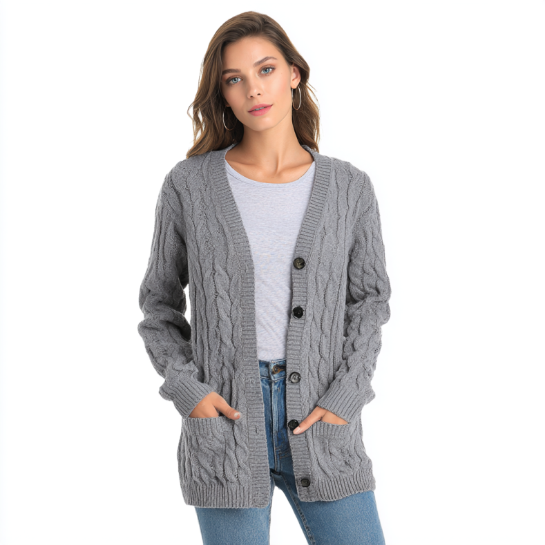 Add a touch of sophistication to your outfit with this gray cardigan from AAEDA. Its simple yet stylish design makes it the perfect layering piece for any occasion. Whether paired with jeans or a dress, this cardigan ensures a polished look.