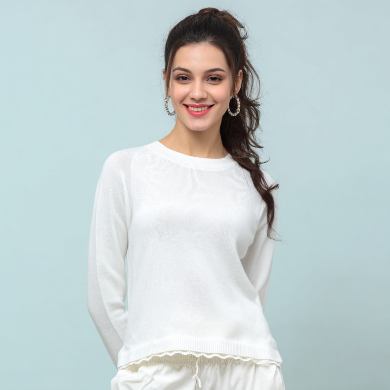 Refresh your wardrobe with this white pullover sweater from AAEDA, made with lightweight rayon for all-day comfort. Perfect for layering or wearing on its own, this timeless piece adds a touch of elegance to any outfit.
